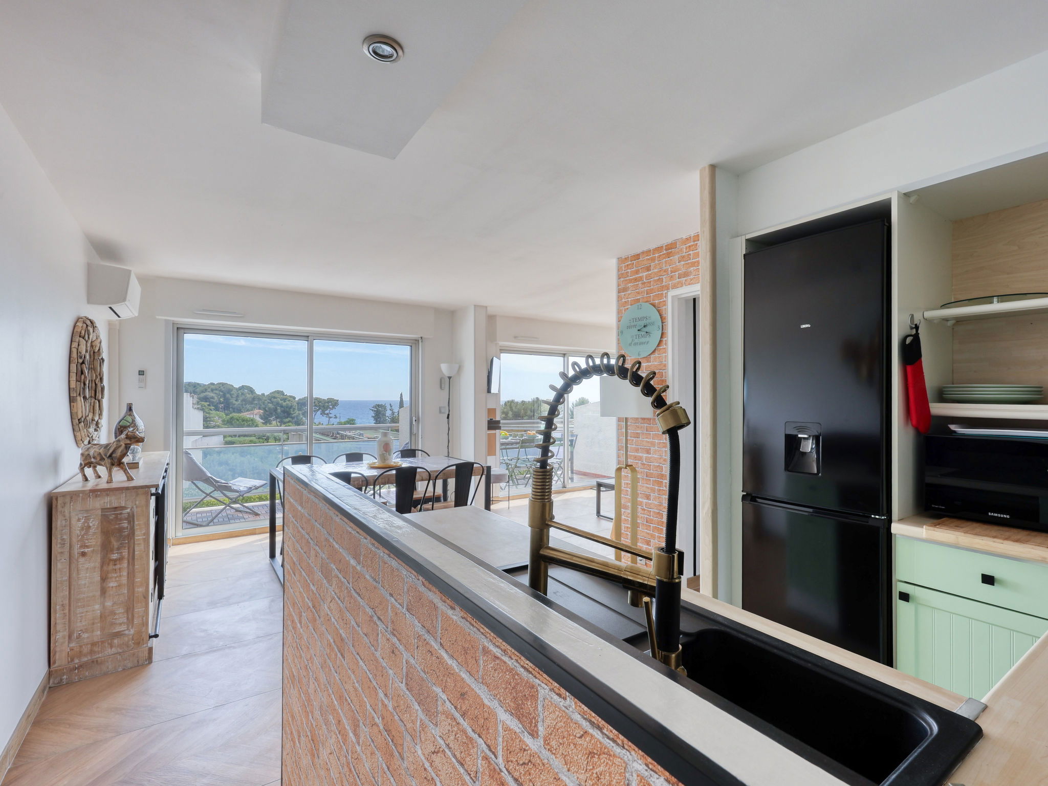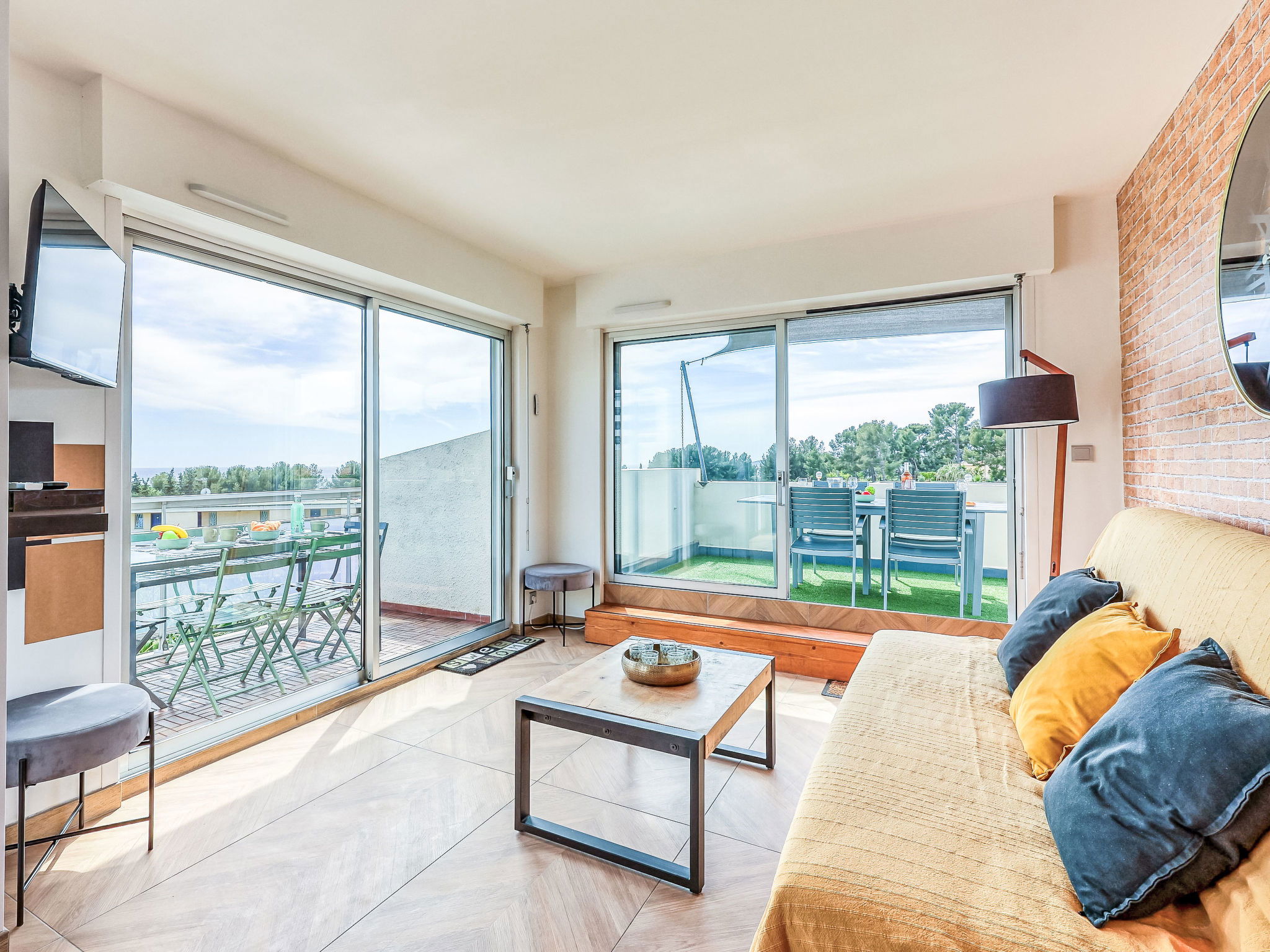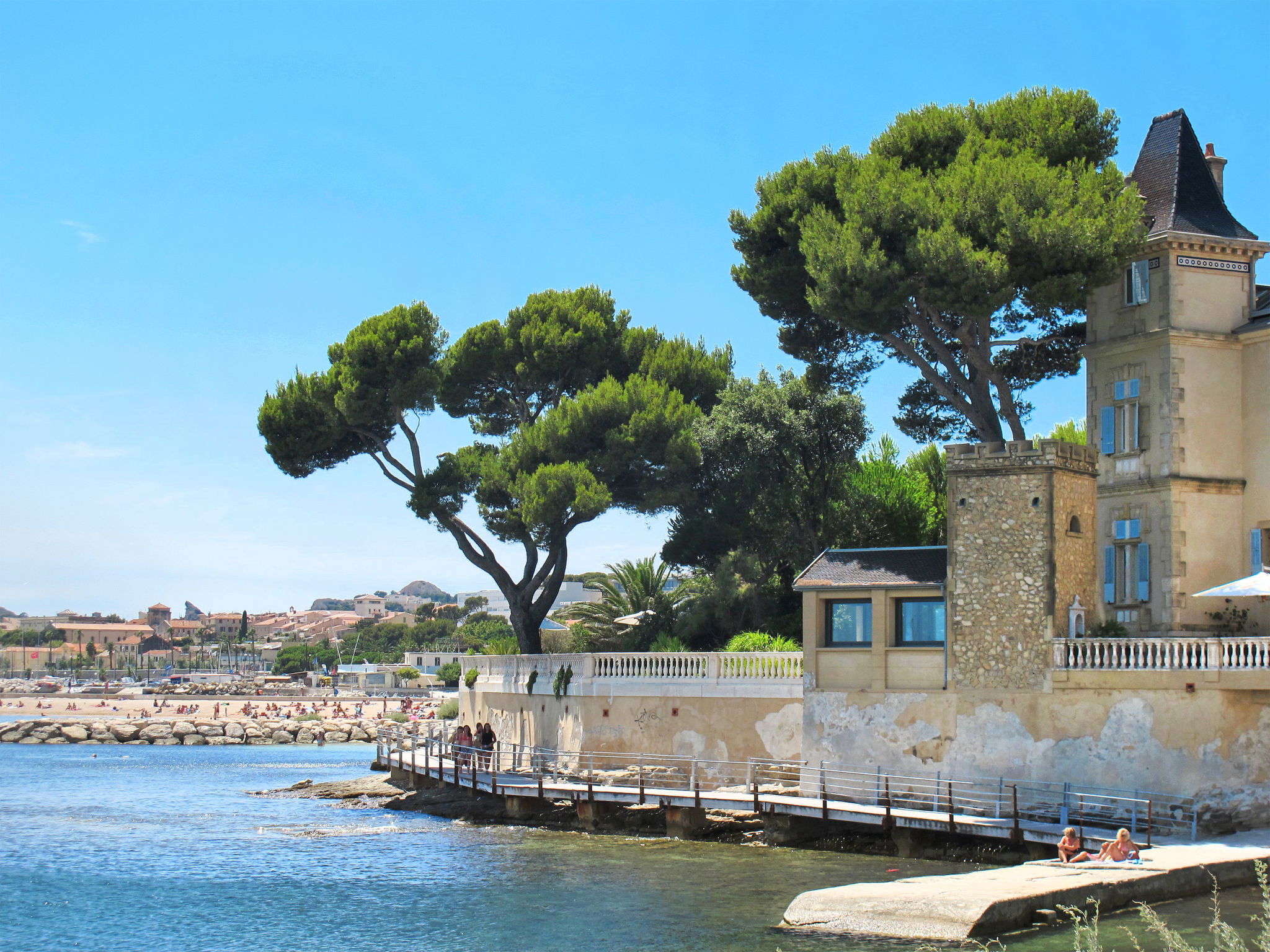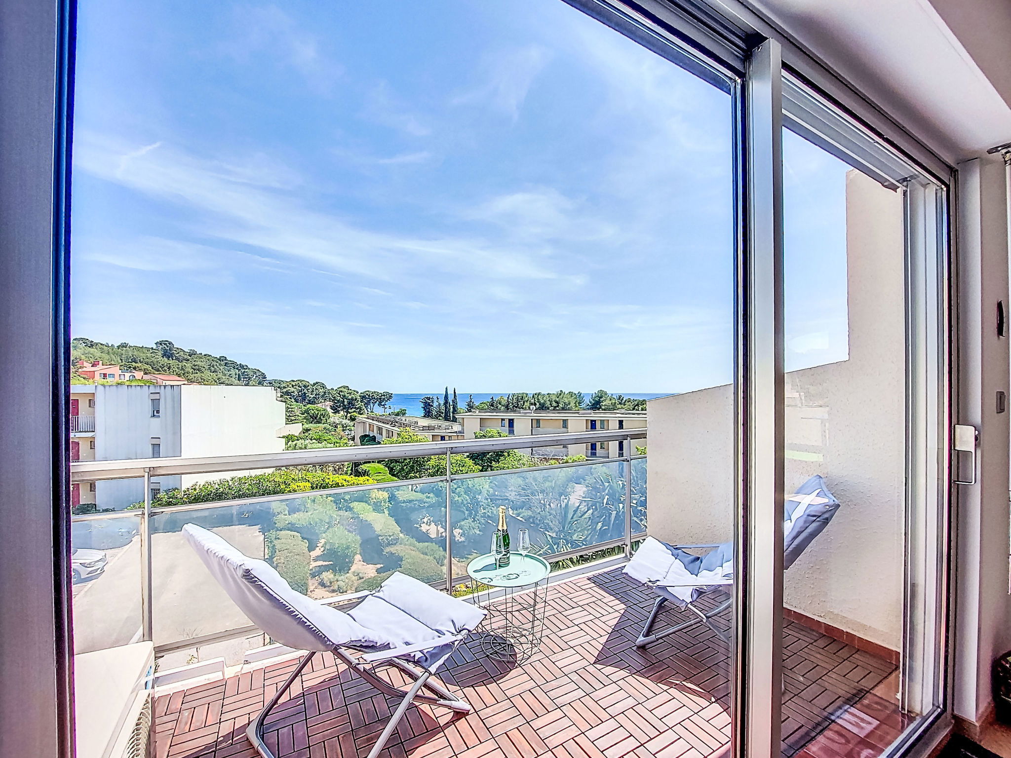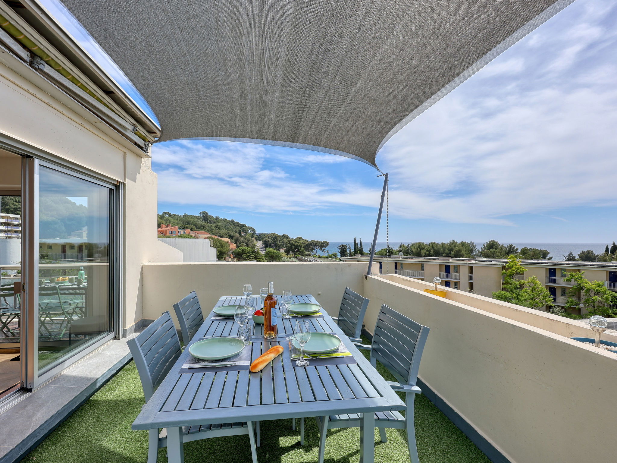 Appartement de 2 pièces 55 m2 au 2ème étage. Clair, aménagement confortable et agréable: séjour/salle à manger avec 1 divan-lit double (140 cm, longueur 190 cm), TV (écran plat), air-conditionné. Sortie sur la terrasse. 1 chambre avec 1 grand-lit (140 cm, longueur 190 cm), air-conditionné. Cuisine ouverte (four, lave-vaisselle, 4 plaques à induction, grille-pain, bouilloire électrique, micro-ondes, congélateur, cafetière électrique, Capsules pour machine à café (Senseo) (NON INCLUSES)). Douche, WC séparé. Chauffage à air chaud. Grande terrasse 24 m2, 2 terrasses 5 m2. Meubles de terrasse, barbecue électrique. Vue sur la mer. A disposition: lave-linge, sèche-linge, fer à repasser, lit bébé jusqu'à 2 ans. Internet (Connexion WIFI, gratuit). Place de parking No 701 (1 Voiture). Veuillez noter: logement non-fumeur. TV seulement FR. Détecteur de fumée. Annonce d'un particulier (art 155, IV du CGI). 13028002054CU