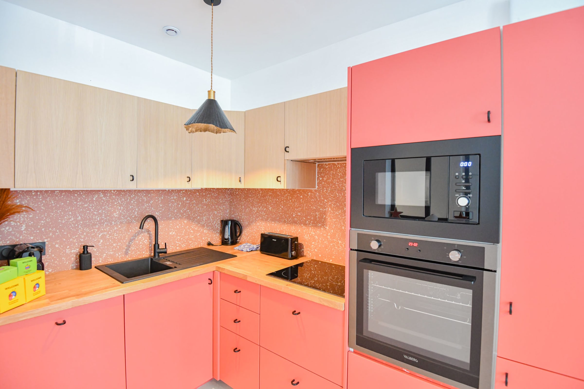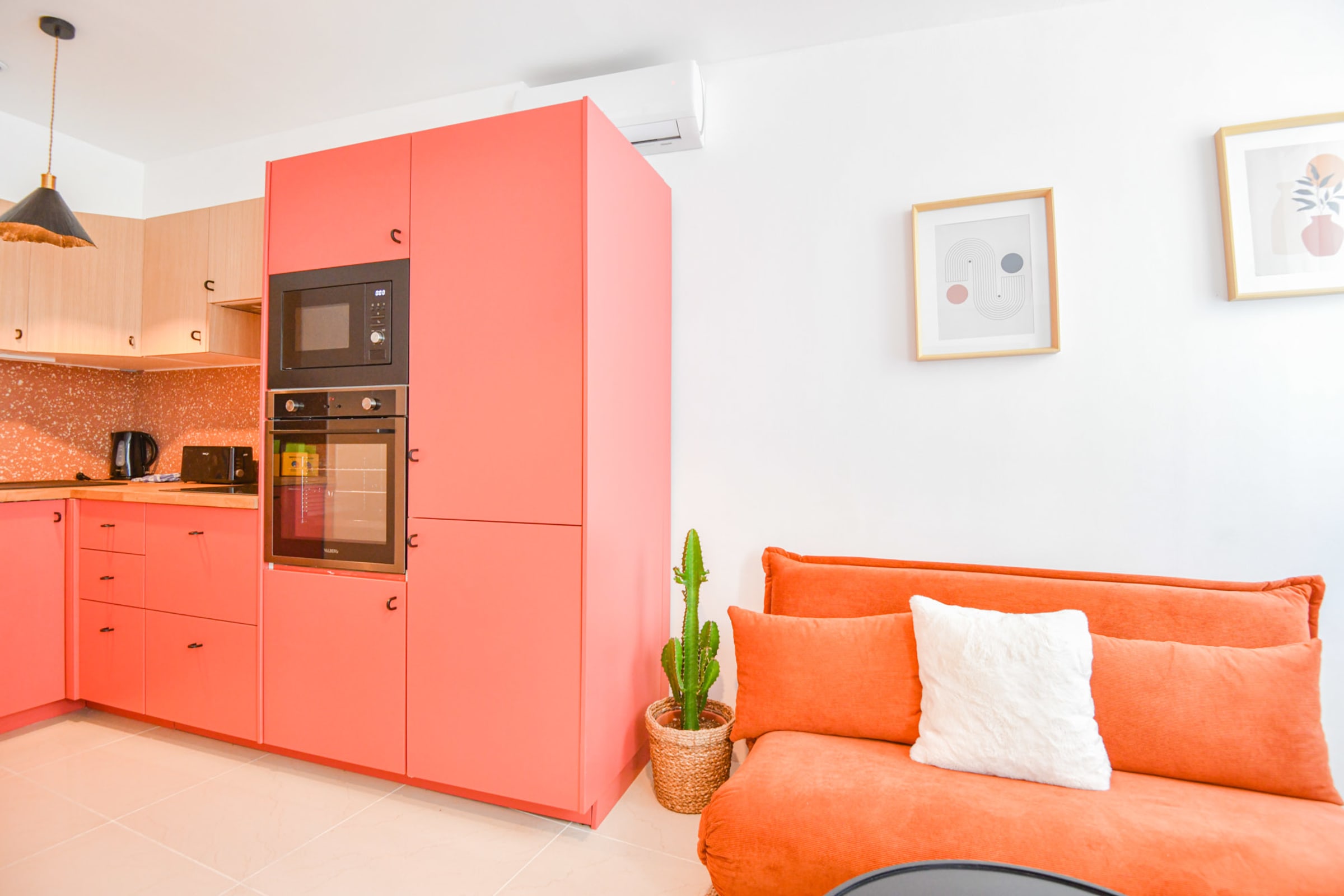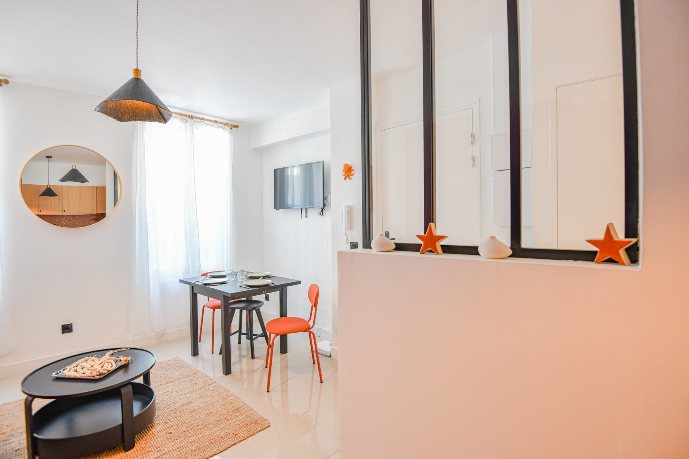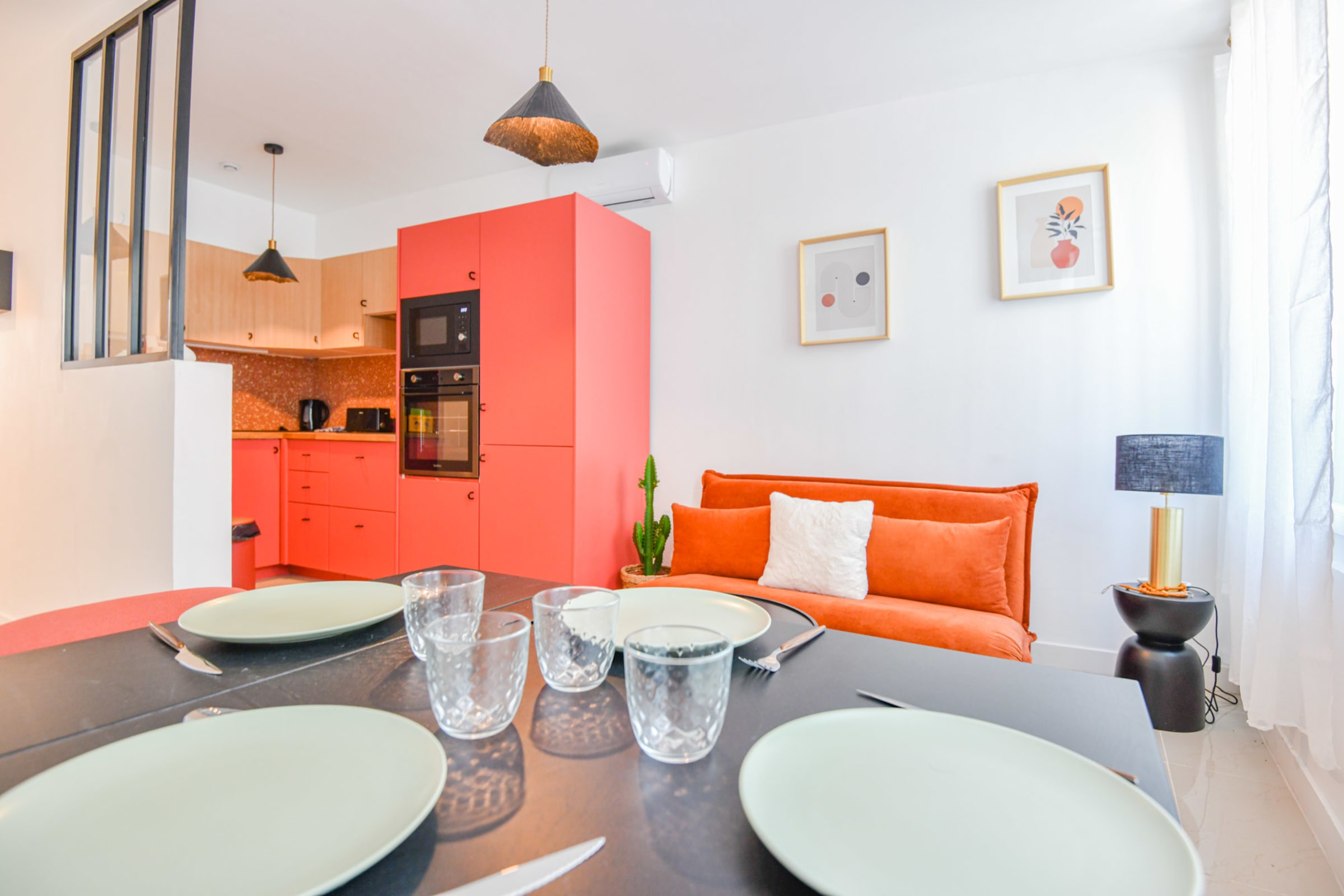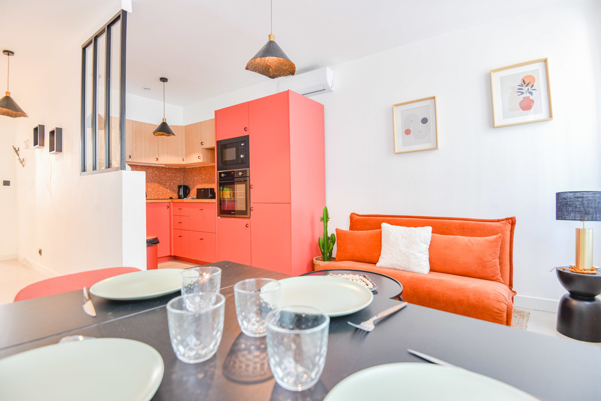Le logement, rénové en 2023 par un architecte d'intérieur, se compose d'une cuisine entièrement équipée donnant sur un salon avec un canapé et un coin dîner prendre vos repas. Le logement a été décoré avec goût.