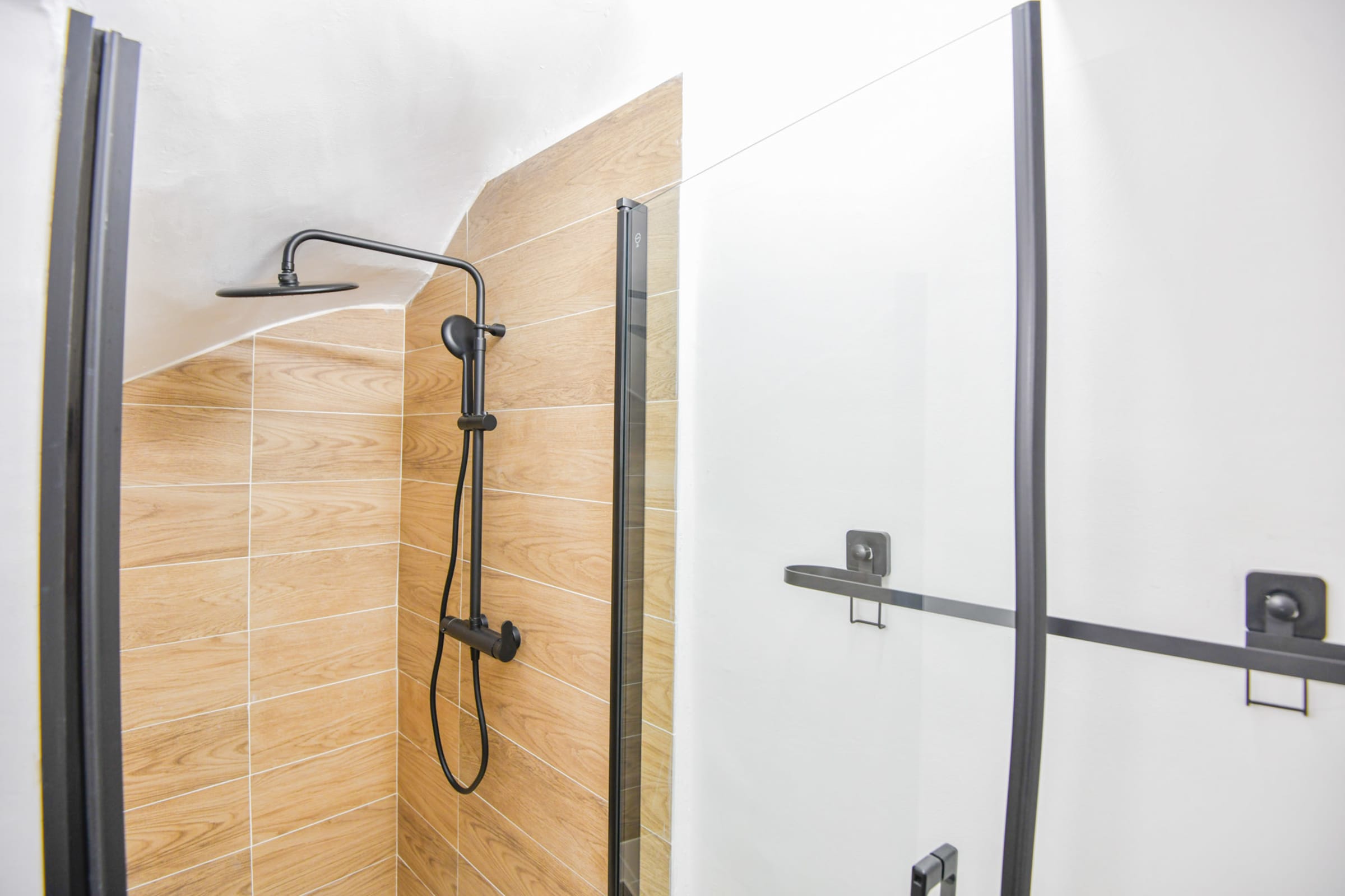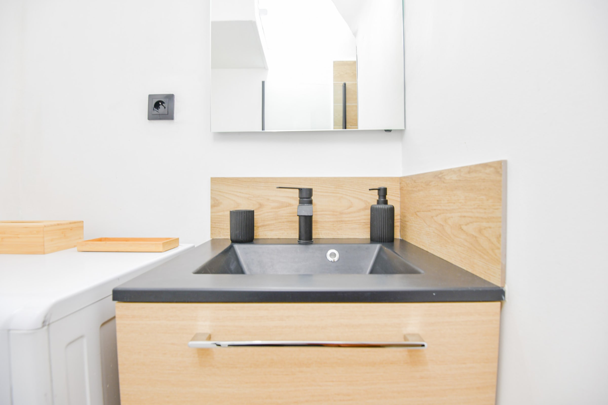 La salle de bain est équipée d'une douche, d'un meuble vasque et d'un WC.