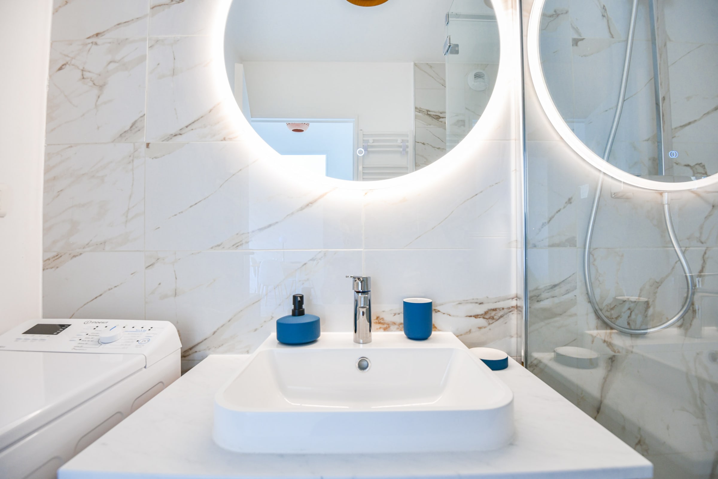 La salle de bain est équipée d'une douche à l'italienne, d'un meuble vasque et d'un lave-linge. WC séparé.