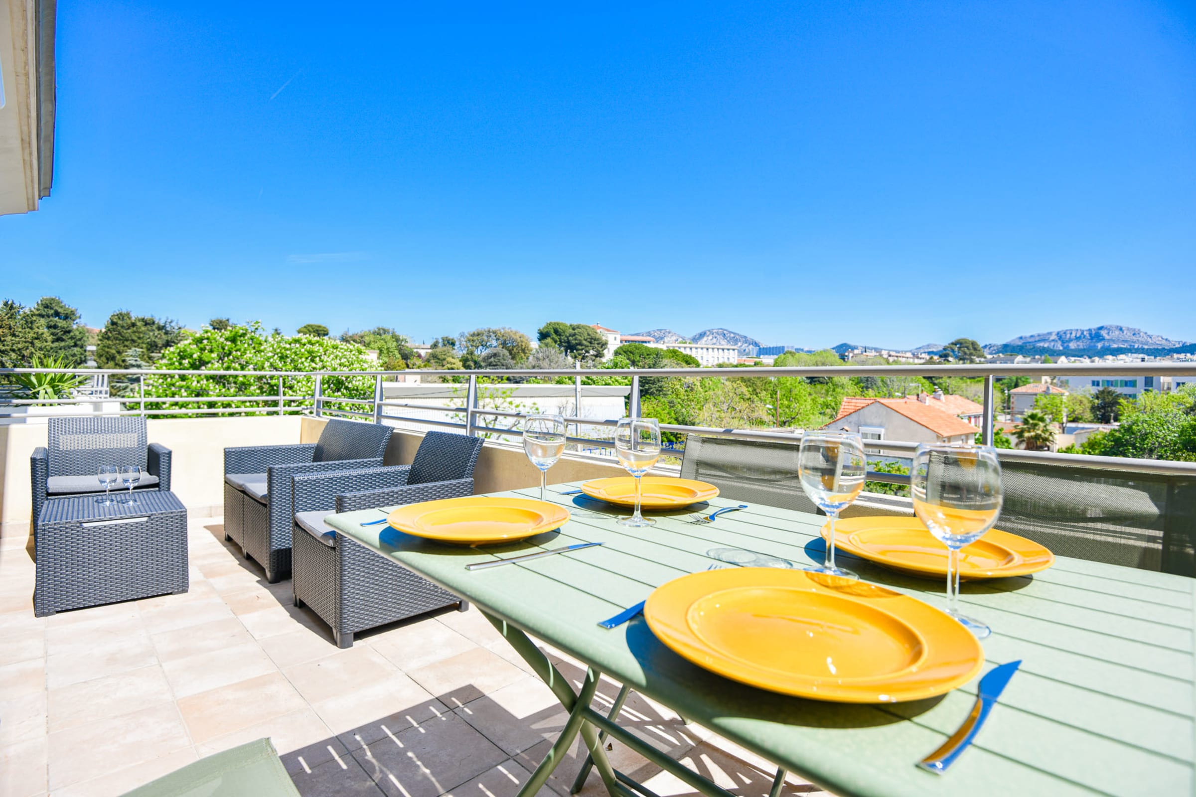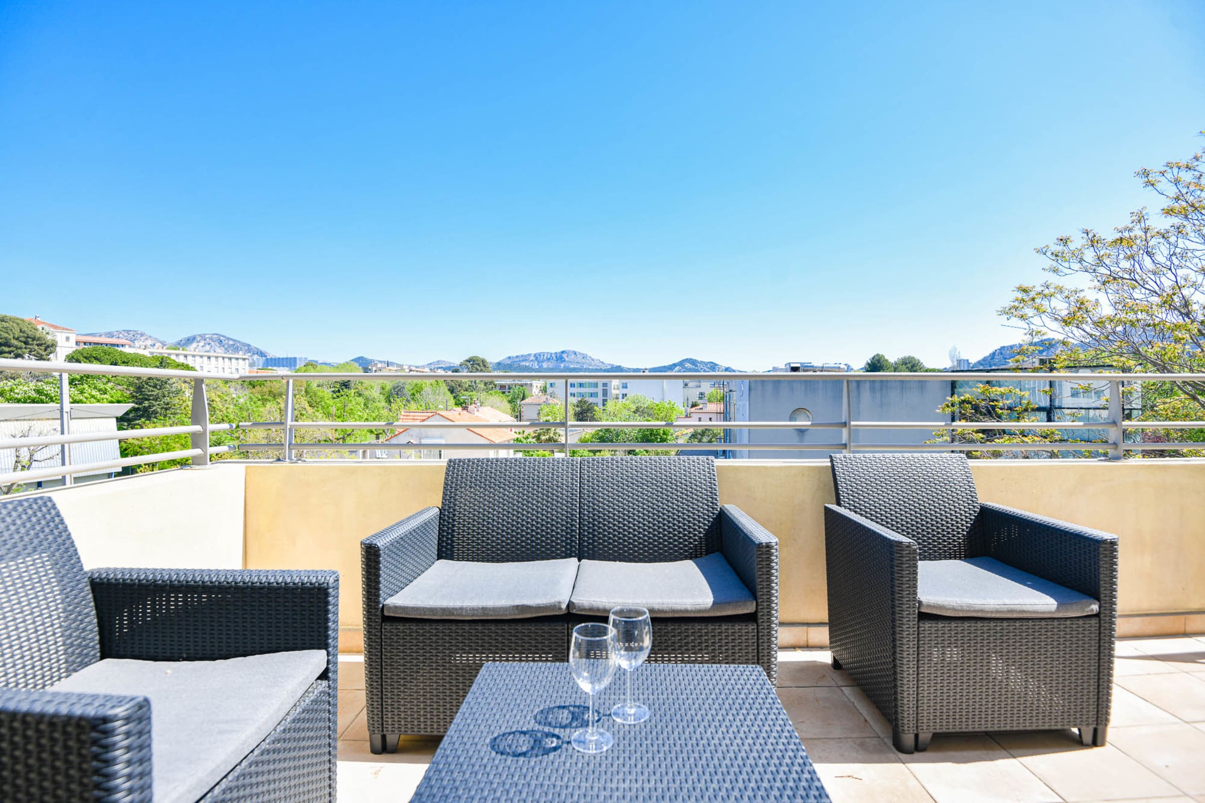 Le logement se compose d'une cuisine entièrement équipée ouverte sur une belle pièce à vivre et une grande terrasse qui offre une vue magnifique sur les collines des Calanques de Marseille. La terrasse est particulièrement agréable pour vous reposer et vous détendre.